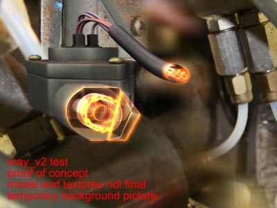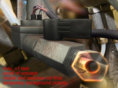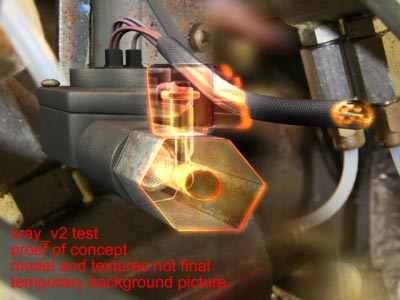 | The goal with this project was create an xray vision effect. These are the initial tests to generate the required mattes and determine what might be involved. The goal was to be able to peel away reality from the cameras viewpoint. | Please note the background image is a hodgepodge of industrial parts cobbled together for this test. I developed the models and textures only to the point where a test could be conducted. | |||