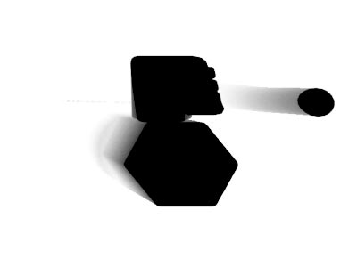 | Here is another frame from the initial test. Something to try in the next test would be to limit the effect to a binocular type matte. The idea would be to simulate using your xray vision to peer and look through physical geometry. | This matte was generated using lights in conjuction with the clipping plane of the camera. This was the most difficult matte to figure out but it turned out to be achieveable with a simple trick. You could also use this matte to put realistic textures back into the geometry in compositing. | |||