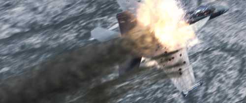 Notes: In this shot the f18 is a miniature and the flames are practical. This was a complex keying and matting job. Chris Arqueta finished this shot beautifully. What is shown is the work I completed before Chris taking the shot. |